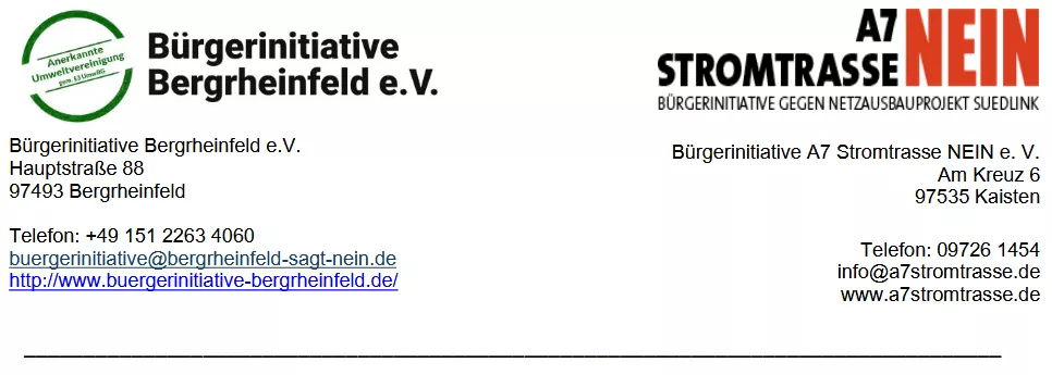 Die Bürgerinitiativen Wasserlosen und Bergrheinfeld, die auch dem Aktionsbündnis Trassengegner angehören, hatten deshalb beim symbolischen Spatenstich für den Südlink zum Protest aufgerufen. Die Kritik an diesem überdimensionierten Netzausbau und die Forderung für eine Energiewende mit einem dezentraleren System haben wir lautstark und deutlich geäußert. Unsere Forderungen nach einer Überprüfung alter Trassenprojekte halten wir für realistisch und dringend notwendig. Bundesnetzagentur und Politik sind hier gefordert und können sich nicht länger taub stellen.
