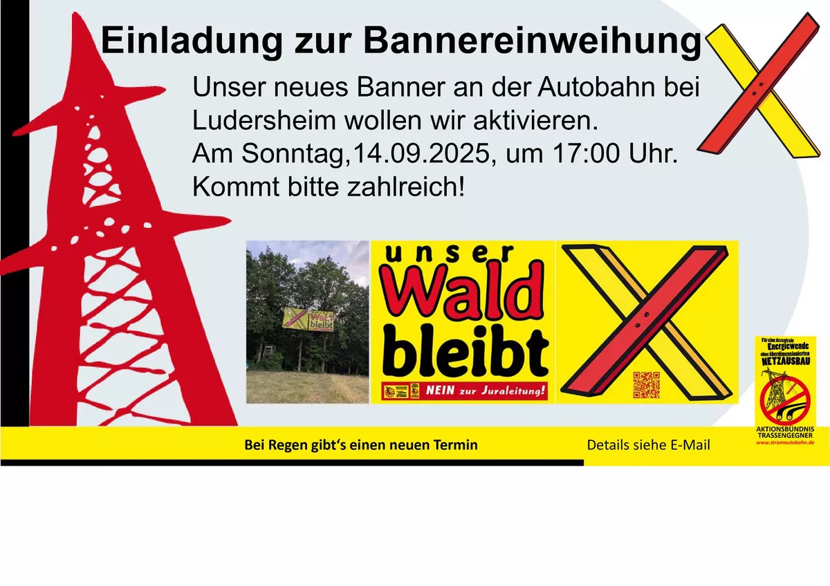 Das neue große Banner am Waldrand in Ludershein nahe der Autobahn ist aufgehängt. Jetzt muss es natürlich auch eingeweiht werden. Das soll im Rahmen einer Aktion am Sonntag den 14. September um 17:00 Uhr geschehen, zu der wir herzlich einladen (siehe nachstehende und auch beigefügte Anlage).