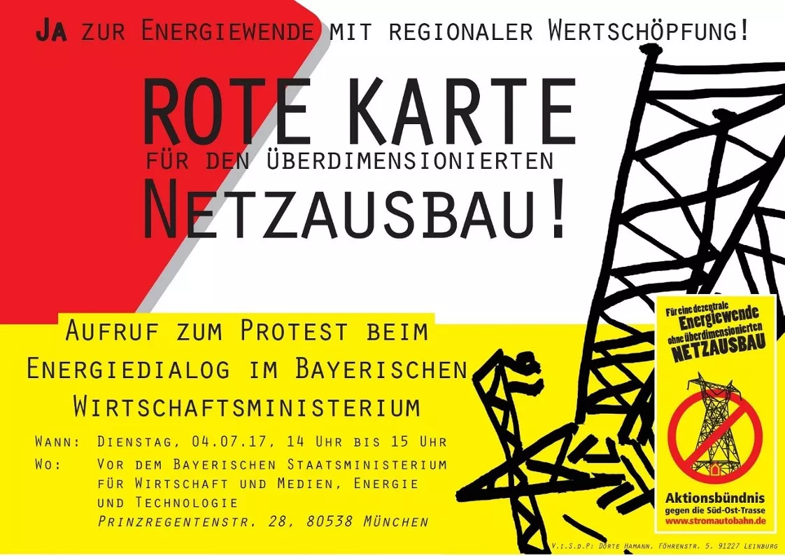 Das bayerische Wirtschaftsministerium hat für den 4. Juli 2017 zu einer Nachfolgetagung zum Energiedialog eingeladen. Die Agenda enthält kein Wort über den fatalen Netzausbau. Dafür gibt es die rote Karte. Nachstehend der Aufruf zu einer Protestaktion, an der sich neben dem Aktionsbündnis gegen die Süd-Ost-Trasse auch die Freien Wähler, die Linke, der BUND und viele weitere Gruppen beteiligen.