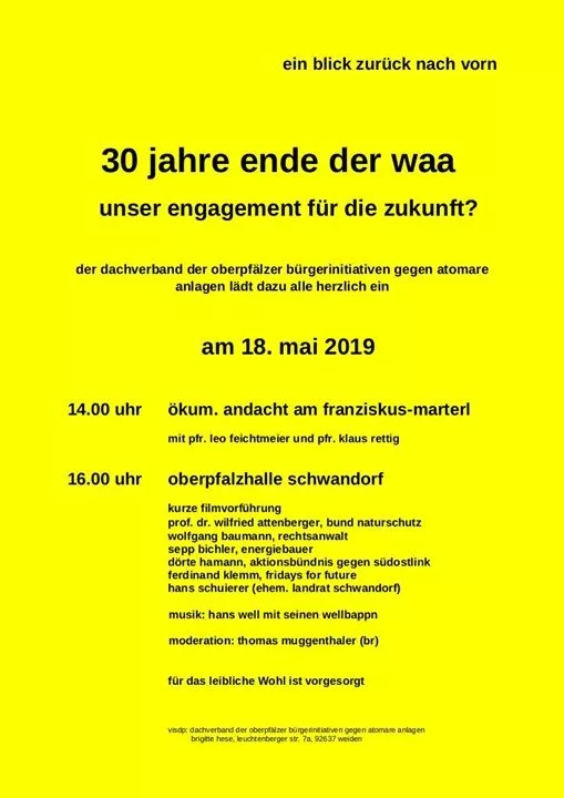 Am Samstag, den 18. Mai 2019, findet am Franziskus-Marterl und im Anschluss in der Oberpfalzhalle in Schwandorf eine wichtige Veranstaltung statt. Zum einen wird 30 Jahre Ende der WAA gedacht. Es sollen aber auch an die kommenden Entwicklungen in den Fokus genommen werden: Wie sieht es aus bei den Themen Klimawandel, Energiewende und Netzausbau? Wie können wir uns engagieren?